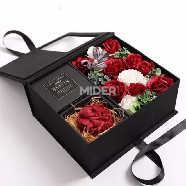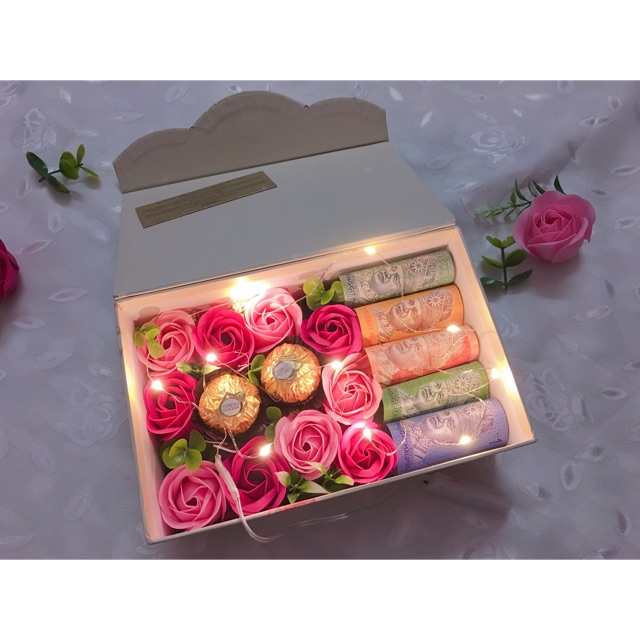 Each trinity box comes ready with 9 fresh roses accentuated with crystals and ferrero rocher chocolate bits in a lower drawer.