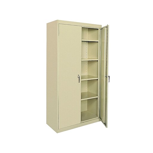 This sandusky lee ca41361872 09 classic series storage cabinet is made of welded steel for strength and has a black powder coat finish for resistance to chipping and corrosion four adjustable shelves two hinged doors and a swing handle with a lock and three point locking system for security.