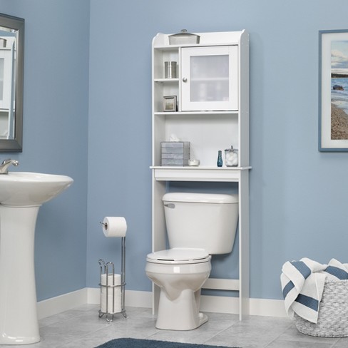 The sauder caraway soft white etagere offers a durable reliable and convenient addition to a wide variety of home bathroom arrangements.